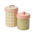 This ceramic container features hand painted irregular green stripes that contrasts nicely with the speckled coral pink lid with a ball handle. With a sealed interior, this versatile canister can be used for storing food, plant accessories, & more.
